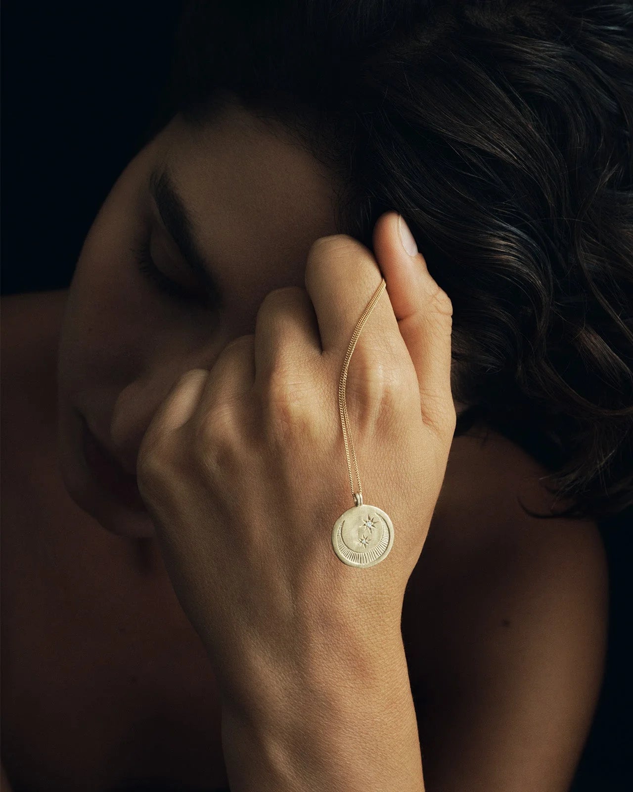 Handcrafted from softly brushed yellow gold, the beloved Temple of the Sun Celeste Necklace is a classic coin pendant paired with by a gold diamond cut cable chain. The imperfect face of this heavenly pendant is embossed with a crescent moon and is adorned with sparkling stars of conflict-free natural diamonds.