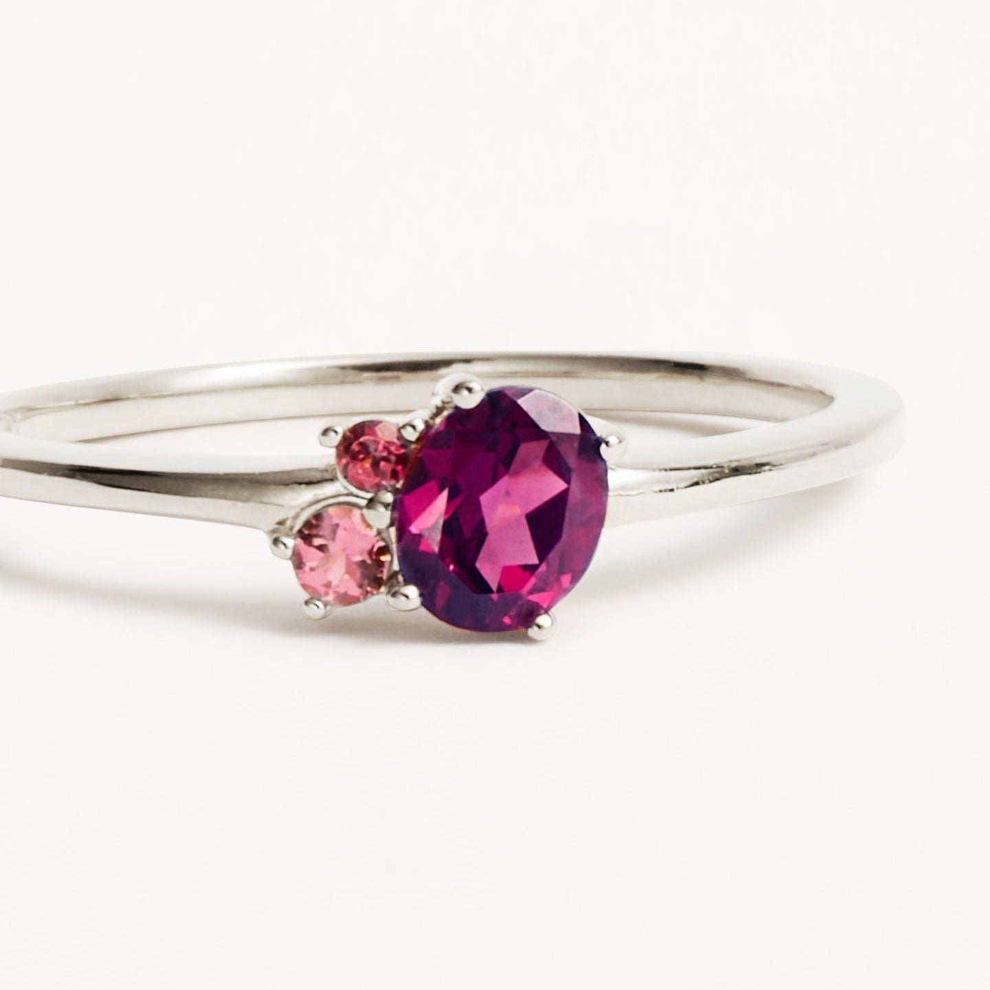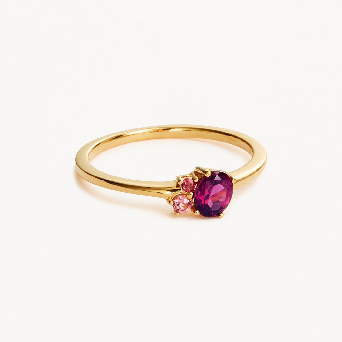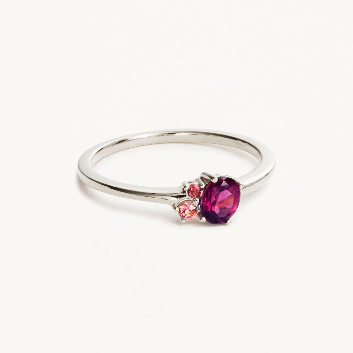 By Charlottes Kindred July Birthstone Ring features a kaleidoscopic cluster of ethically and sustainably sourced natural pink tourmaline and rhodolite.