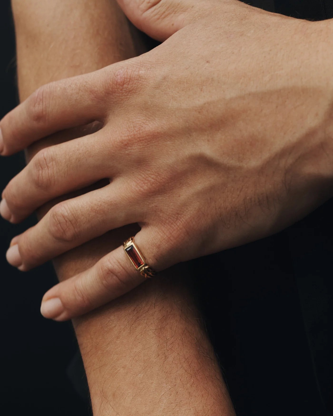 The Airla Ring is a solitaire design featuring an east-west set baguette-cut garnet. The 18k gold vermeil band is formed by two cord-like strands, joined at the shoulders with love knots. Inspired by ancient tradition, the Herakles knots symbolise eternal love and enduring connection, their continuous loops echoing the rhythms and cycles of life.