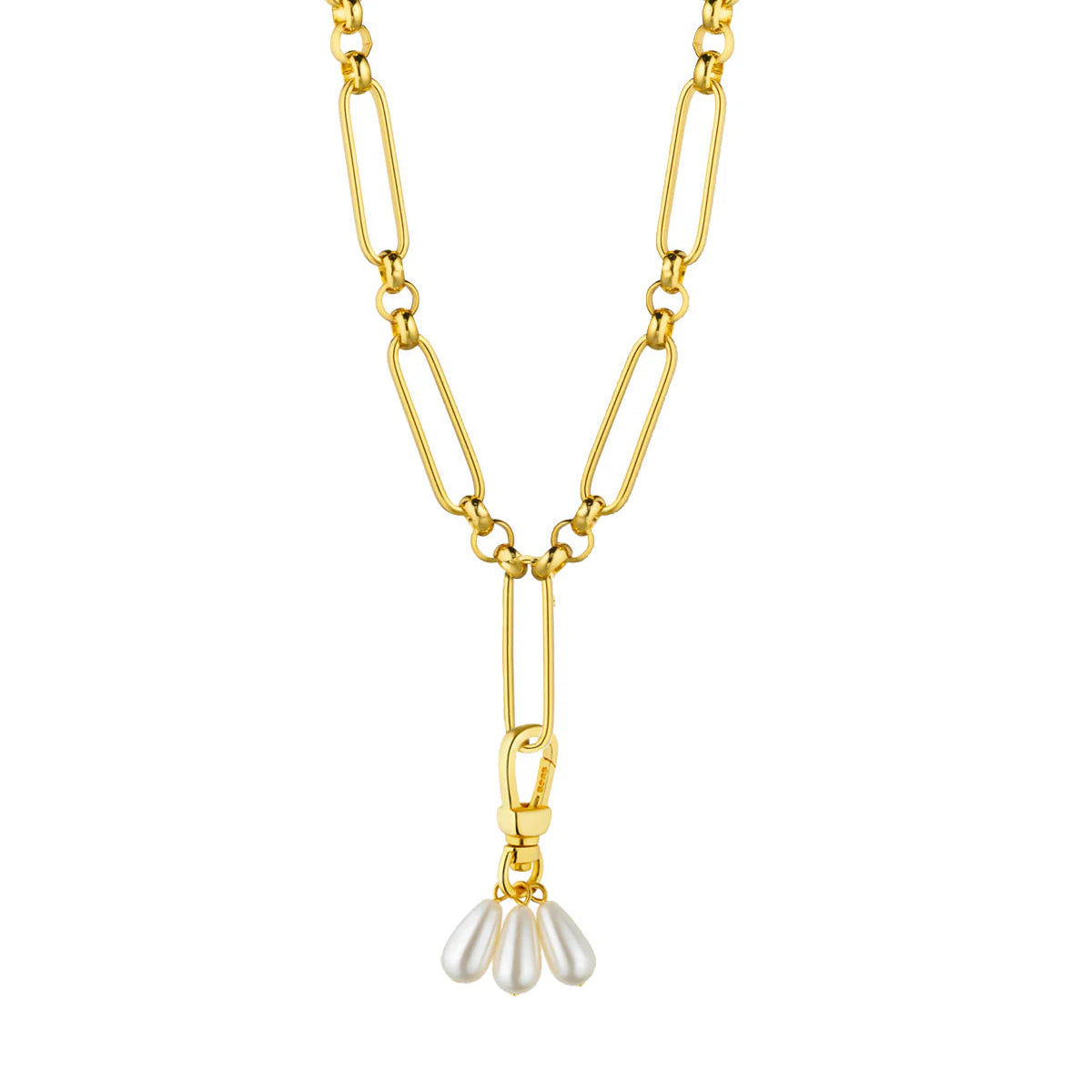 Refined yet contemporary, Avant Studio’s Odette Necklace reimagines classic chain design with a sculptural modernity. The necklace features elongated oval links that create a bold yet fluid silhouette. At its centre, a detachable pendant showcases a trio of luminous freshwater pearls—each one unique in its organic shape and soft lustre—adding an element of understated sophistication.