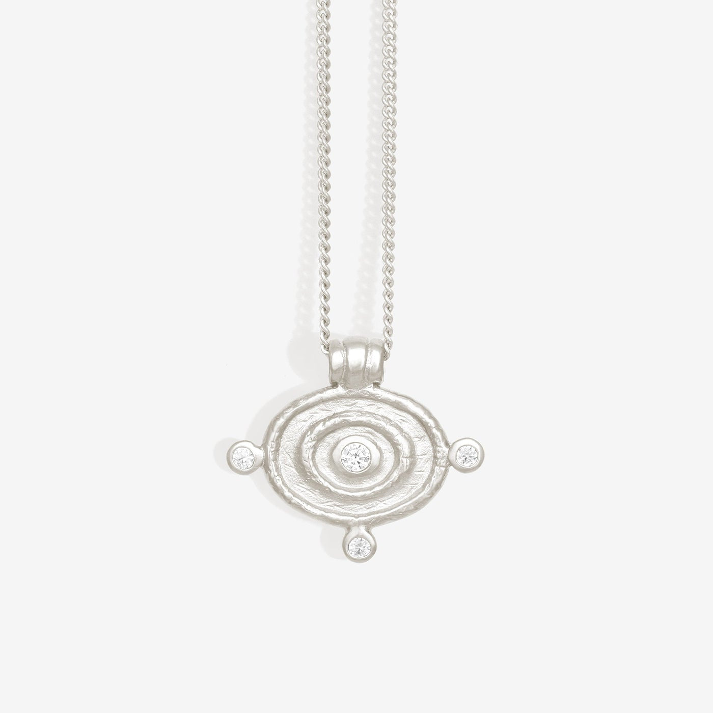 Handcrafted in recycled sterling silver, the Reign Oval Necklace features a single textured oval medallion set with natural zircon, suspended from a fine curb chain.