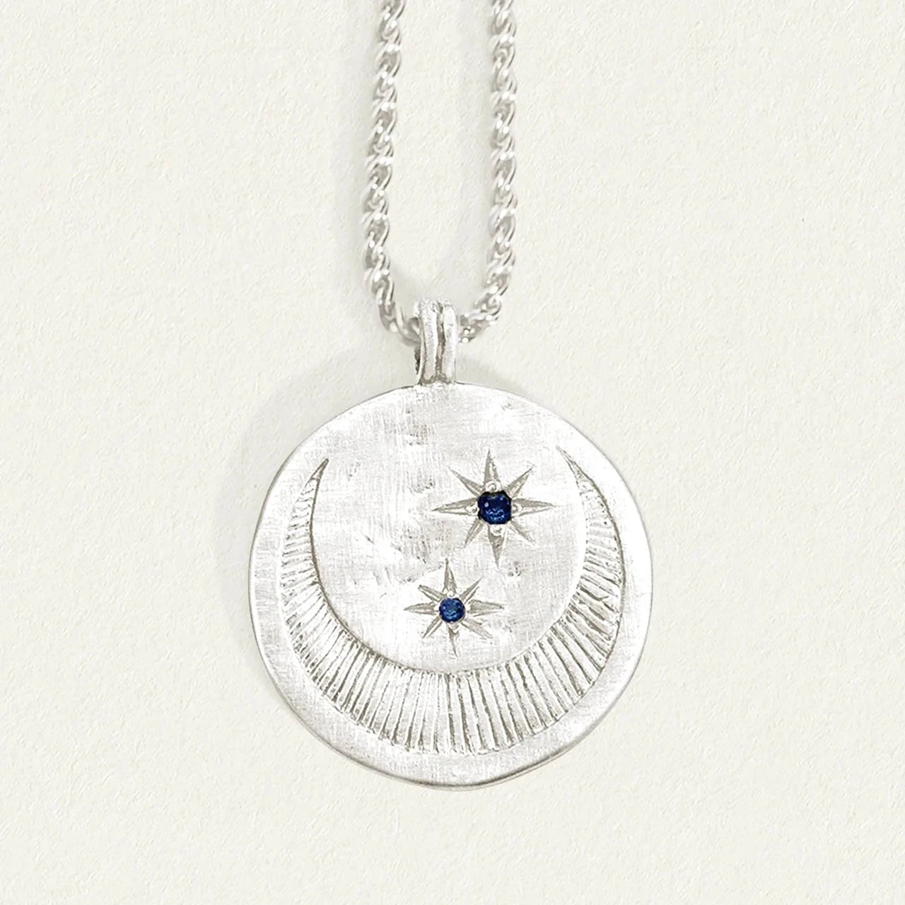 This necklace is a stunning piece featuring a disc pendant with an imperfect face, reminiscent of an ancient coin and set with two beautiful stones; a London Blue Topaz and blue sapphire.