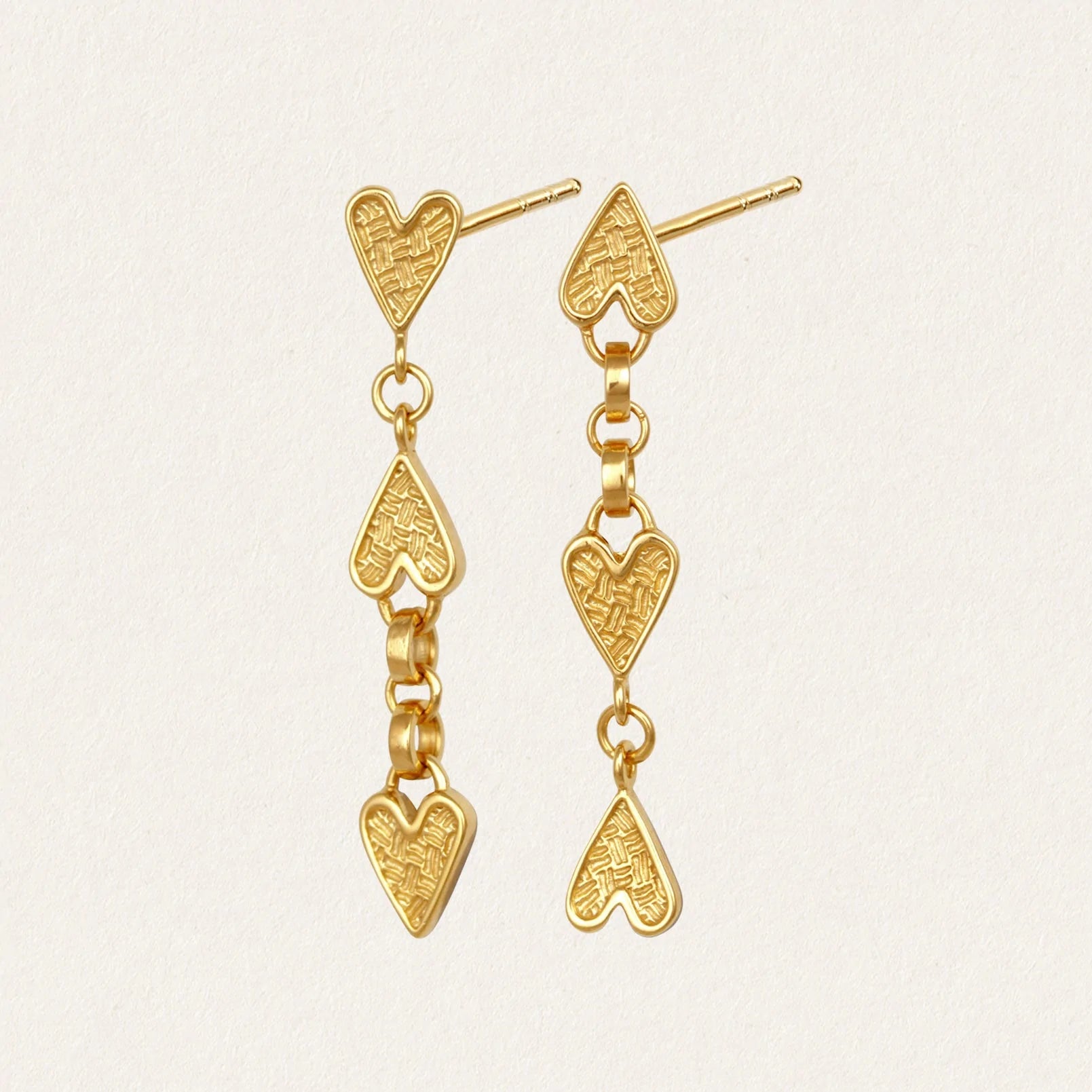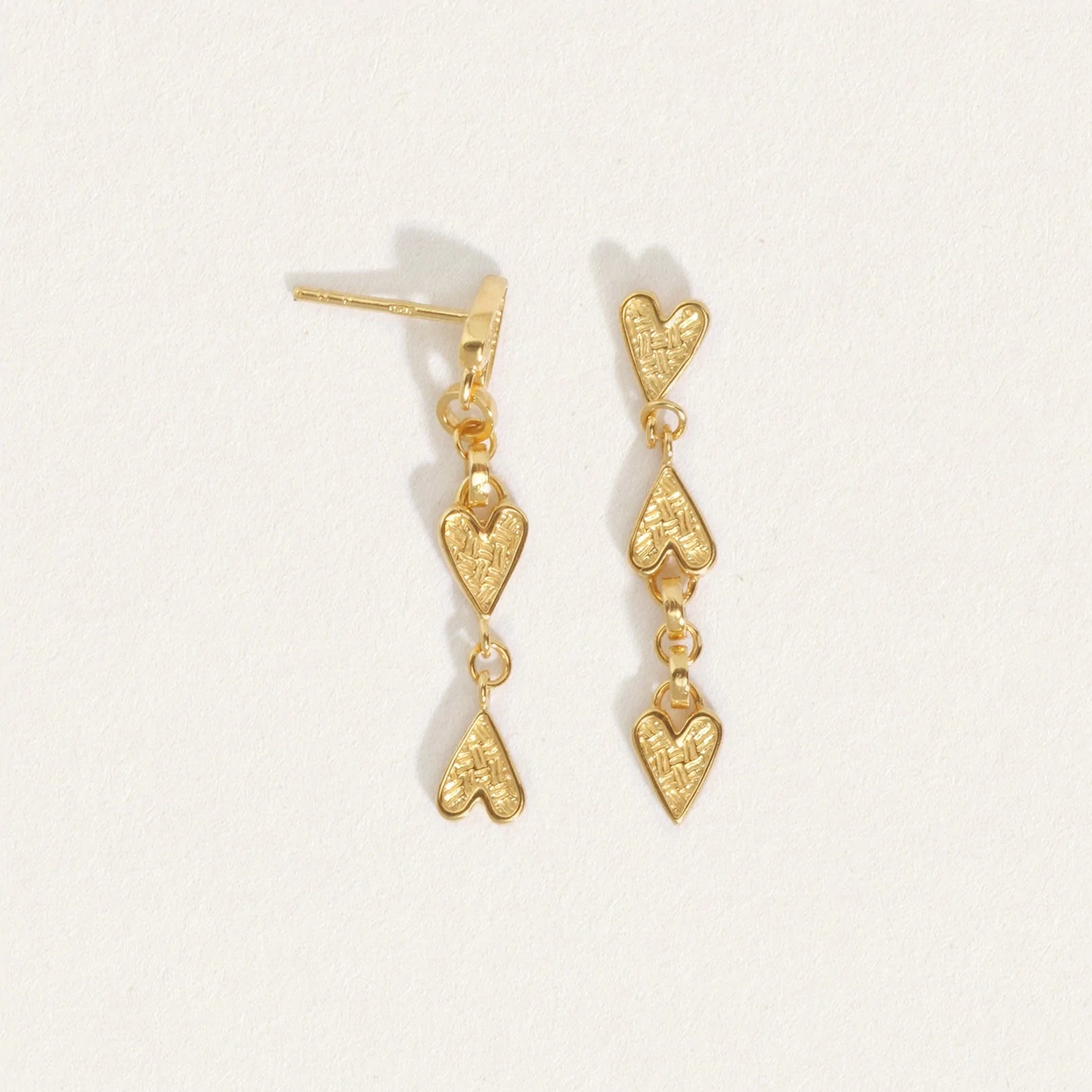 The Amore Earrings are asymmetrical stud earrings fashioned from a series of textural 18k gold vermeil hearts that cascade from the ears in a cheerful dance.