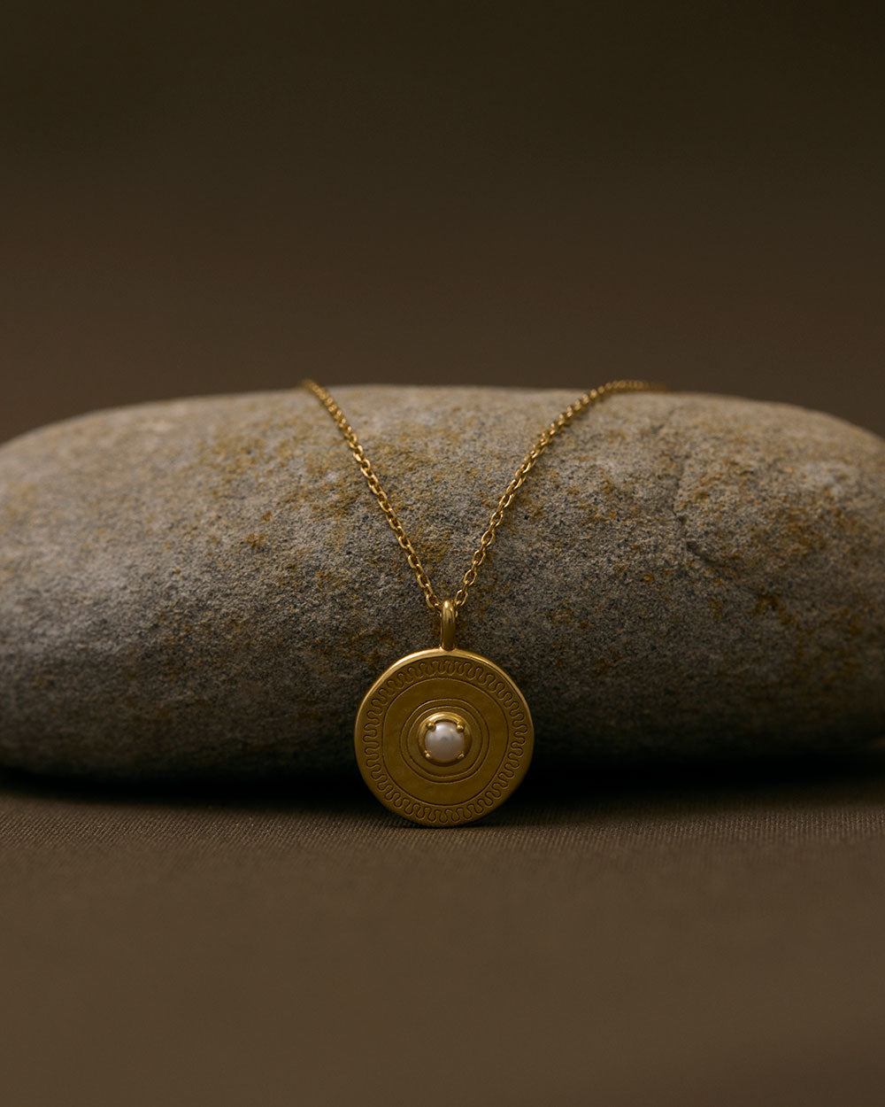 The Solace Coin Necklace features a coin-style pendant, a pearl set centred surrounded by embossed curve details that mimic the gentle ripples of the ocean.