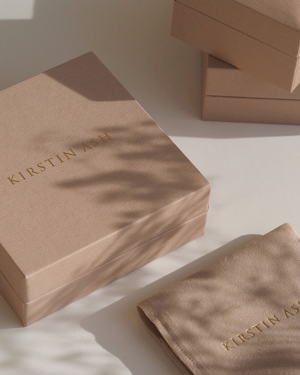 Presented in a pretty Kirstin Ash pouch and box. The boxes are made from 100% recycled card and paper with eco-friendly inks and the soft, reusable vegan suede travel pouch is designed to carry and protect your jewellery.