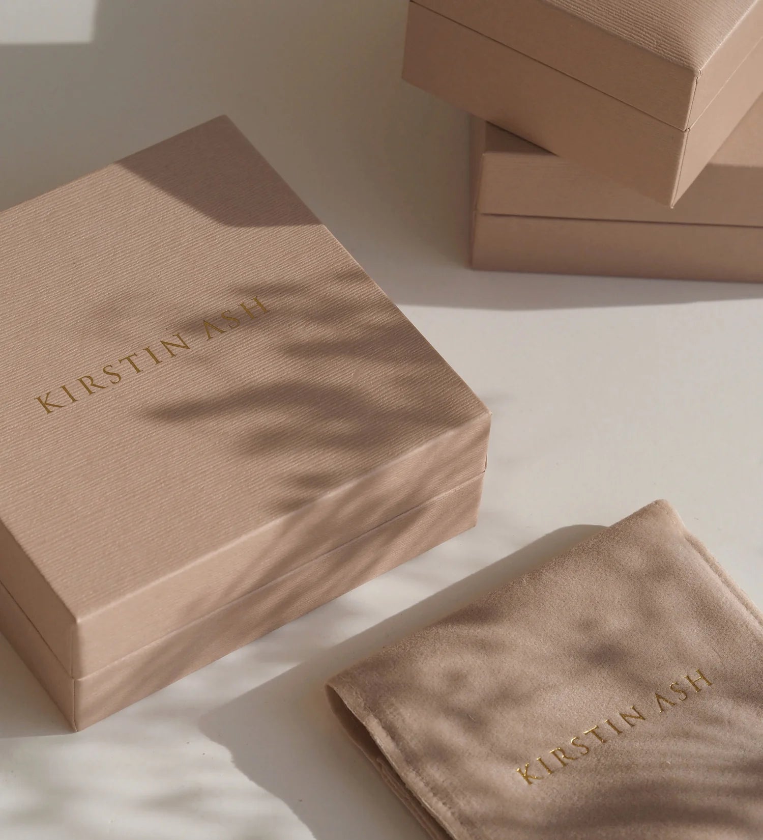 Presented in a pretty Kirstin Ash pouch and box. The boxes are made from 100% recycled card and paper with eco-friendly inks and the soft, reusable vegan suede travel pouch is designed to carry and protect your jewellery.