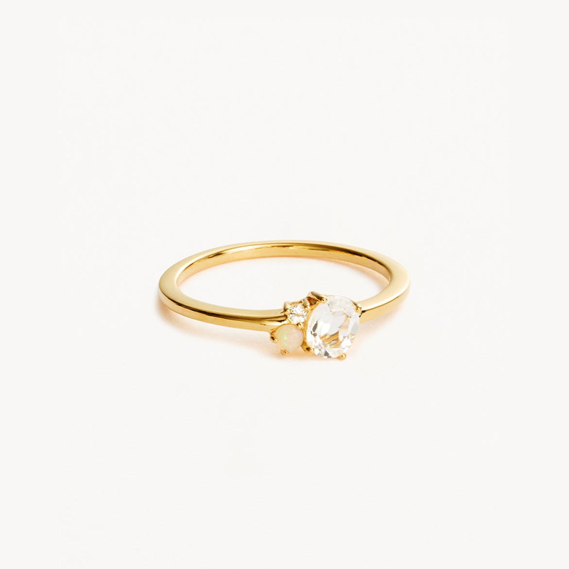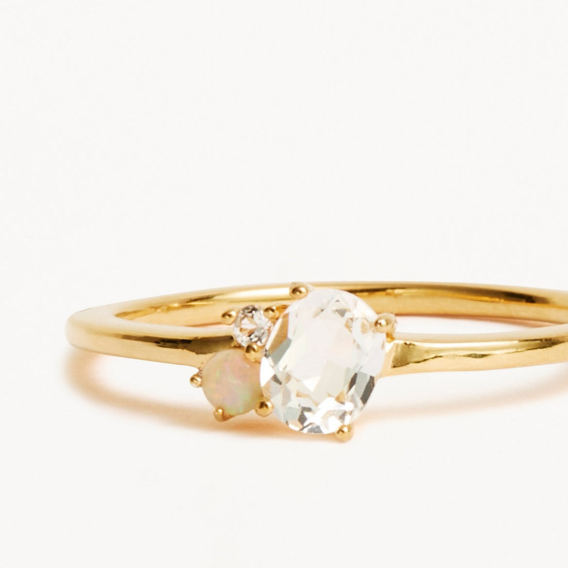 The by Charlotte Gold Kindred April Birthstone Ring features a kaleidoscopic cluster of ethically and sustainably sourced natural gemstones, including white topaz and opal.