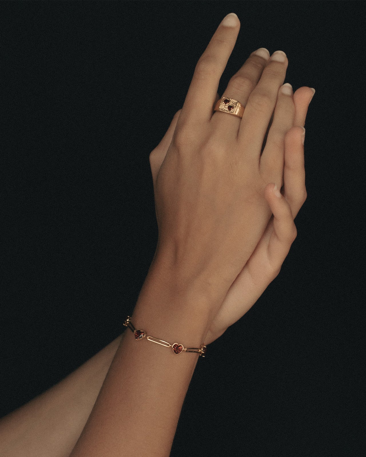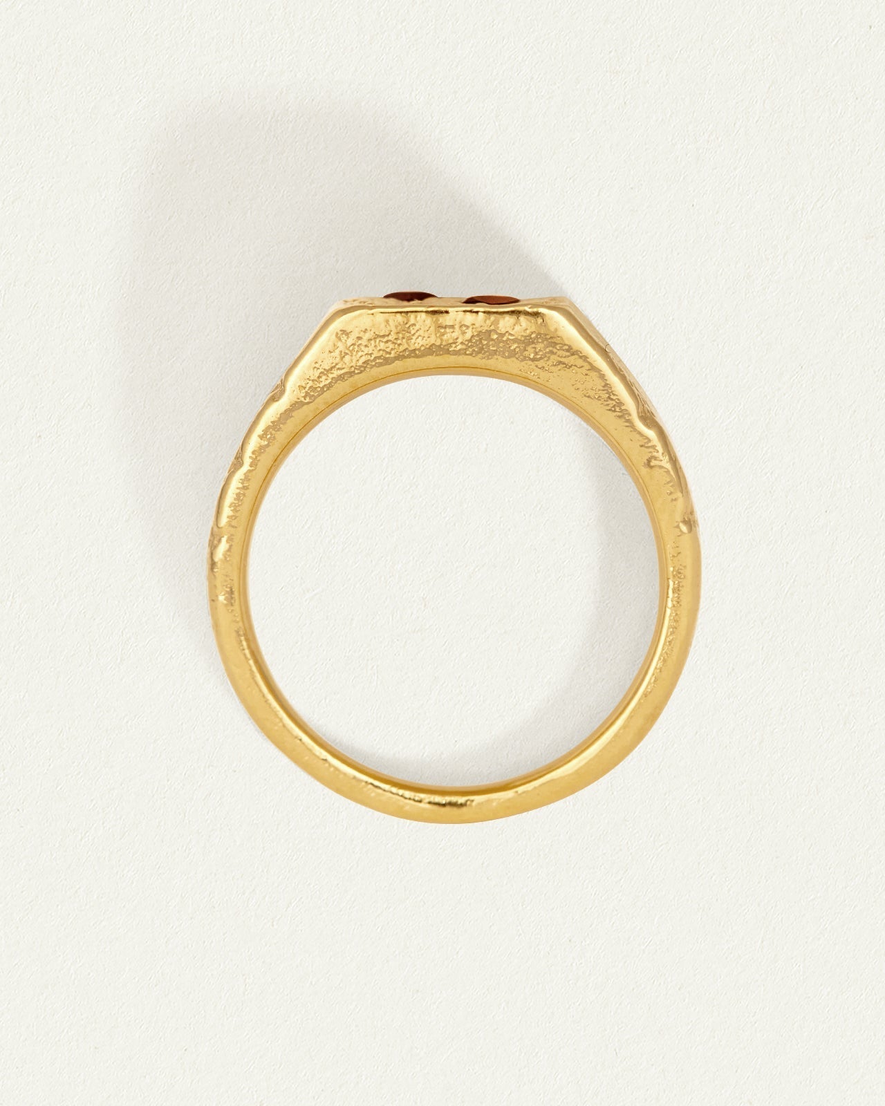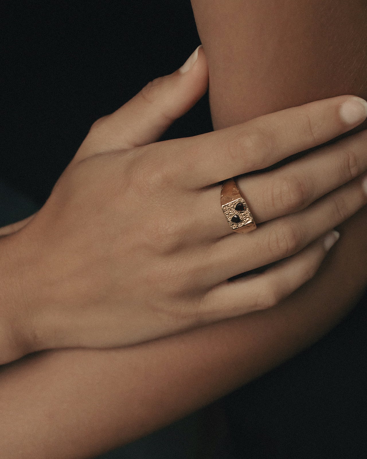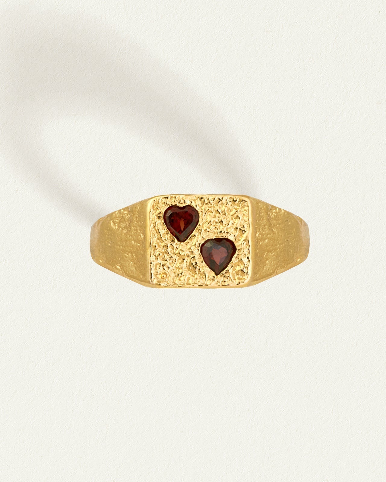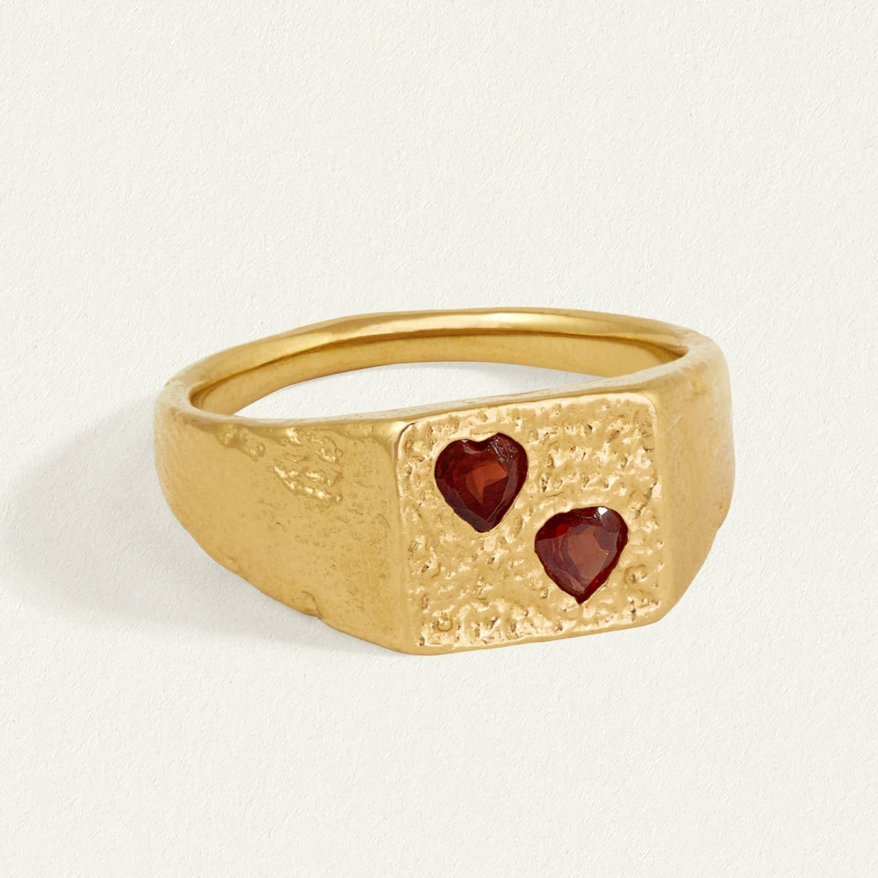 Crafted from 18k gold vermeil, its substantial form is softened by twin heart-shaped garnets lovingly set into textured gold