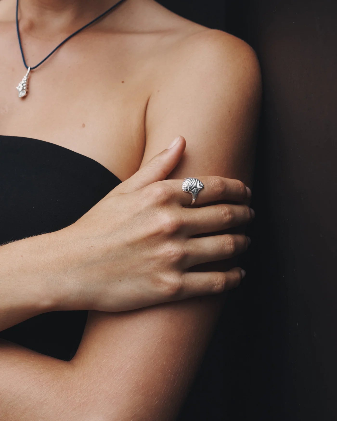 Crafted from recycled sterling silver, the Eleni Ring is a statement piece featuring a large scallop shell, sacred to Aphrodite.