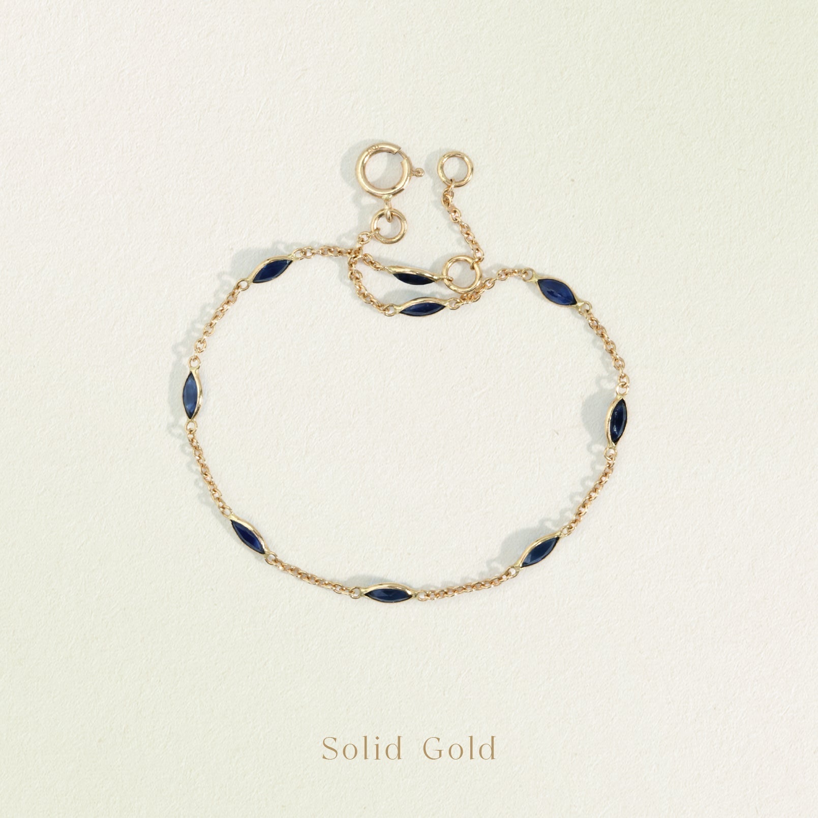 The Lucia Marquise Bracelet in Sapphire is an elevated Temple of the Sun interpretation of their classic gemstone bracelet chain style.