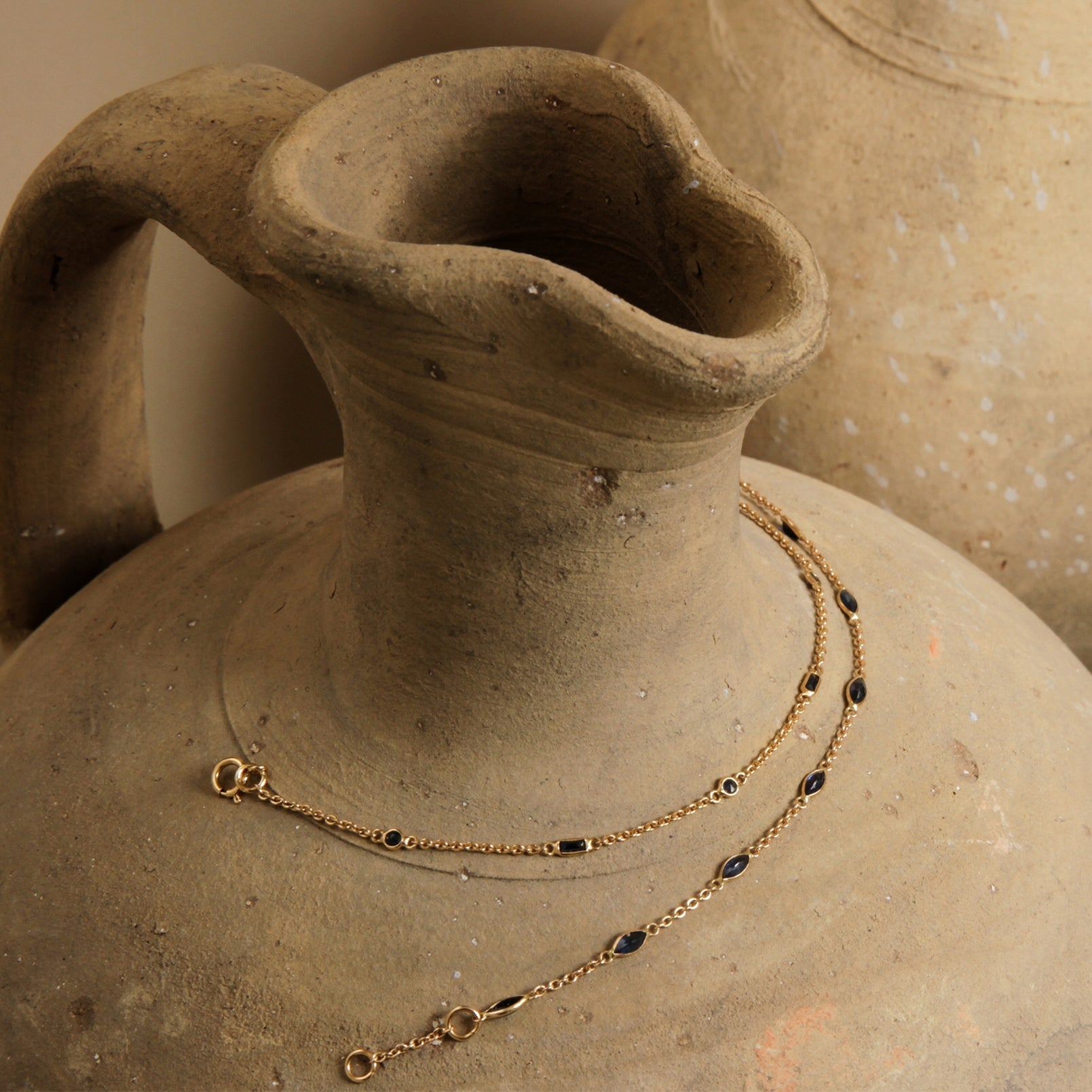 Marquise cut blue Sapphires are bezel set along a delicate cable chain.